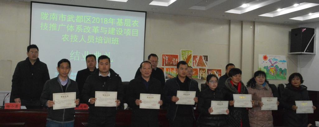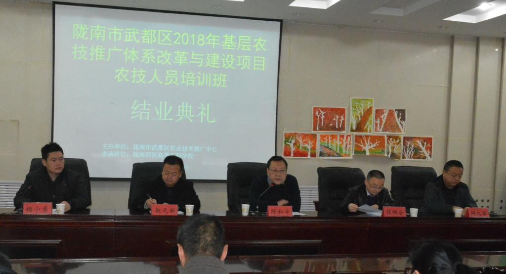 2019年1月7日上午,由陇南市武都区农业技术推广中心组织实施,由陇南师专具体承办的《陇南市武都区2018年基层农技推广体系改革与建设项目农技人员培训》在公司继续教育公司5楼报告厅举行结业典礼。武都区农牧局副局长赵元新,武都区农业技术推广中心主任陈和平,副主任李文生,农林技术公司党总支书记杨小录,副经理何九军出席结业典礼,结业典礼由继续教育公司经理张明会主持。