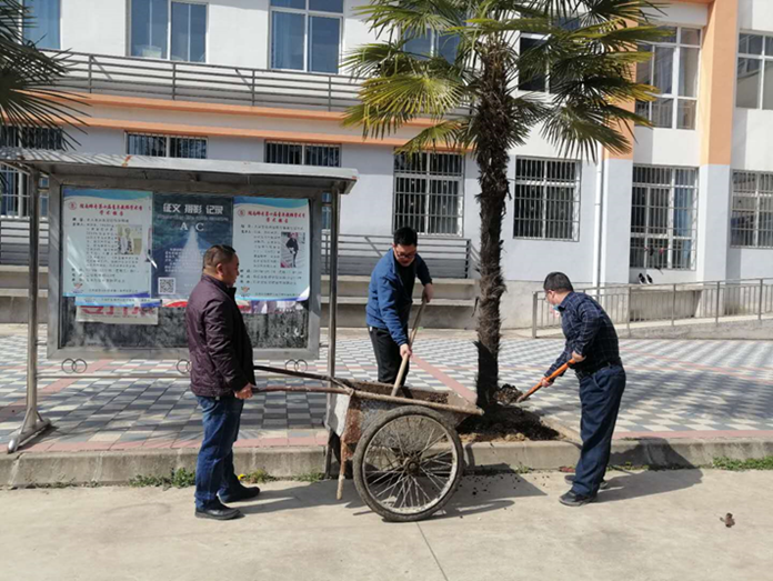 公司经理王让军、党总支书记杨小录、副经理何九军给公司棕榈树施肥。