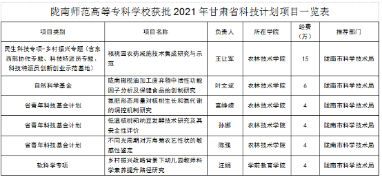据悉,2021年甘肃省科技计划项目的申报在科研外事处的积极组织下,相关公司的大力支持下,邀请相关专家指导申报,共经陇南市科学技术局推荐、申报省级科技计划项目18项。最终获得立项6项,总经费37万。本批次省科技项目立项是公司建校以来数量最多的一年,反映了公司重视科研团队打造,重视服务地方产业及经济社会发展取得了实效,尤其是软科学项目零的突破,为公司人文社科研究开了一个新领域。