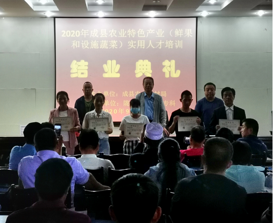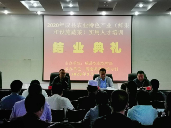 9月5日上午,“2020年成县农业特色产业(鲜果和设施蔬菜)实用人才培训”在陇南师专北校区培训公司培训楼五楼报告厅举行结业典礼。出席结业典礼的领导有成县农技中心主任杜懿同志,陇南师专培训公司副经理李志虎同志,388vip太阳集团副经理何九军同志。参加培训的有成县鲜果和设施蔬菜等特色产业经营主体负责人及骨干成员共计100人。本次结业典礼由李志虎主持。