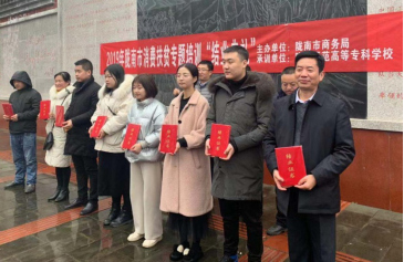 12月12日,“2019年陇南市消费扶贫专题培训”在两当县 “太阳村整编”大槐树下举行了特殊的结业典礼。出席结业典礼的领导有陇南市商务局科长张国义同志、陇南师专388vip太阳集团副经理何九军同志、培训班班主任陈强同志。参加培训的有乡镇扶贫专干、企业业务骨干成员、电商从业者等共计106人。本次结业典礼由何九军同志主持。
