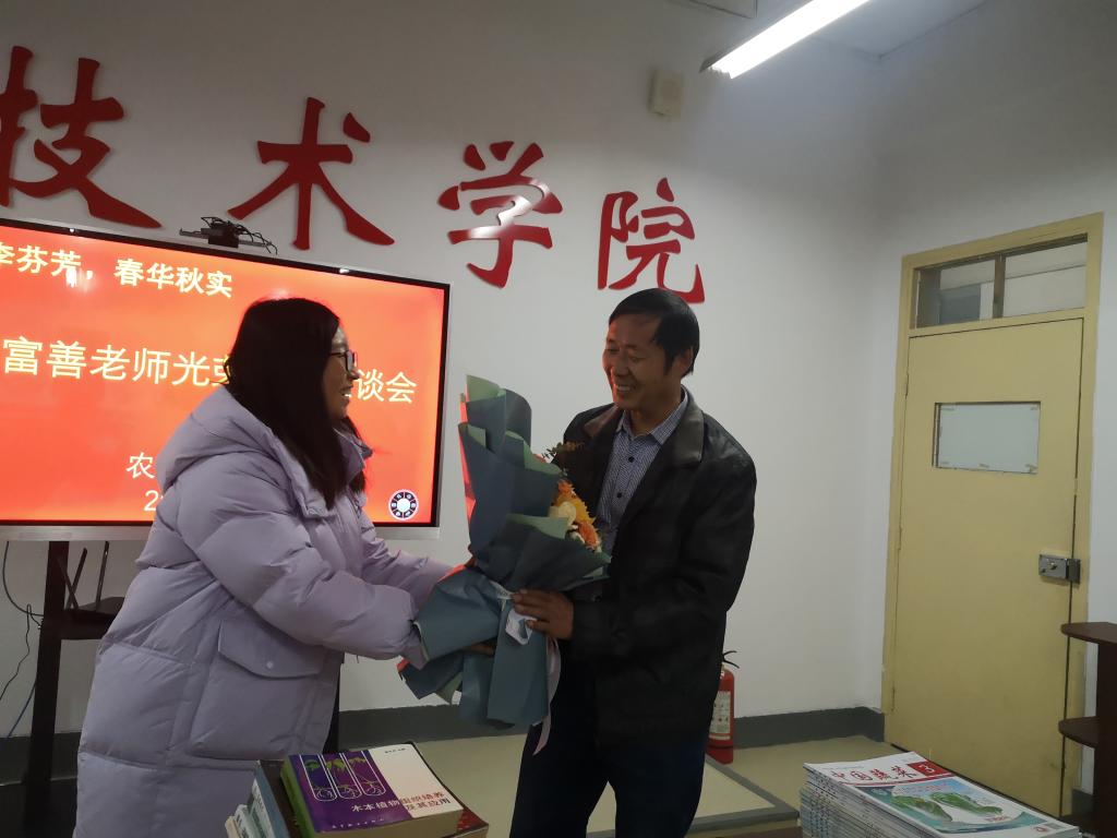 座谈结束后,公司为刘富善老师举行了荣休仪式。青年教师代表为刘老师献上鲜花,王让军经理向刘老师赠送了纪念品。刘老师向公司回赠了自己多年收藏的专业杂志和书籍。