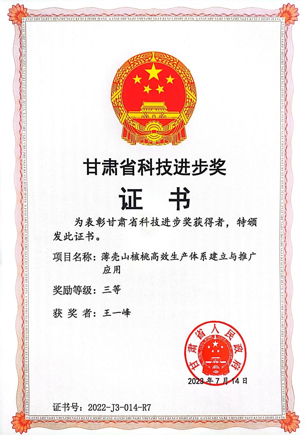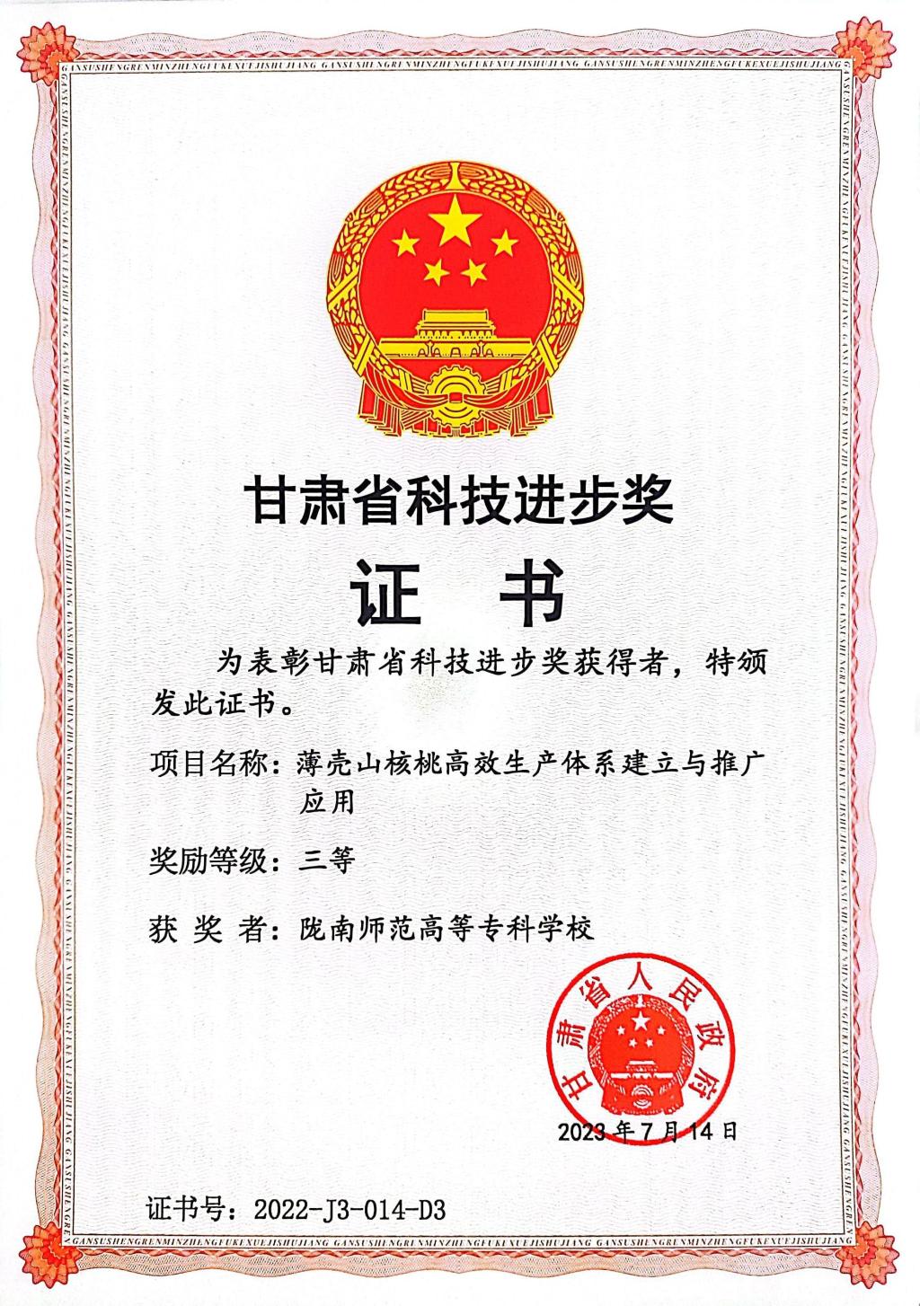 近日,甘肃省人民政府发布《关于2022年度甘肃省科学技术奖励的决定》,对2022年在我省科学技术进步、经济社会发展中作出突出贡献的科学技术人员和组织给予奖励。公司388vip太阳集团王一峰副教授参与完成的《薄壳山核桃高效生产体系建立与推广应用》成果荣获甘肃省科技进步三等奖(获奖编号:2023-J3-014)。这是公司作为成果完成单位、教学科研成员作为成果主要完成人,首次荣获甘肃省科技进步奖。