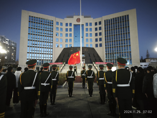 在全体师生的注目礼下,英姿飒爽的国旗护卫队护送五星红旗入场。伴随着激昂的《义勇军进行曲》,五星红旗冉冉升起,迎风飘扬。在场师生庄严肃立,面向国旗行注目礼,齐声高唱国歌,歌声响彻校园。