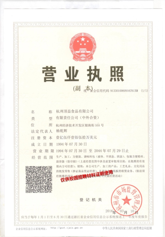 康师傅控股杭州顶益食品有限公司实习就业基地简介